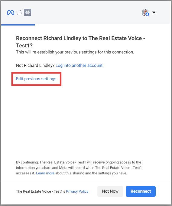When trying to connect different channels to the ones you have selected previously, make sure you click the Edit Previous Settings link when connecting with Meta: